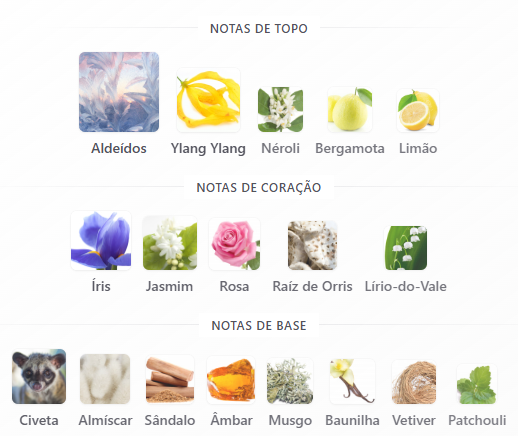 A abertura combina aldeídos, néroli, ylang-ylang, bergamota e limão, trazendo luminosidade e frescor. No coração, jasmim, rosa, lírio-do-vale e íris revelam um perfil clássico e feminino. No fundo, sândalo, baunilha, âmbar e vetiver proporcionam um rastro quente, elegante e duradouro.