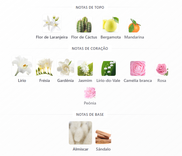 A abertura revela notas refrescantes de flor de laranjeira, bergamota e mandarina, proporcionando uma sensação vibrante e luminosa. No coração, camélia, lírio e rosa formam um bouquet floral elegante e moderno. Já no fundo, almíscar e madeira de sândalo garantem fixação duradoura e um rastro suave e sofisticado.