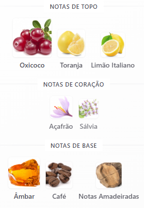 A abertura apresenta toranja vermelha, limão italiano e cranberry, trazendo um frescor frutado estimulante. No coração, lavanda e açafrão adicionam um toque aromático e levemente picante. No fundo, âmbar, café e cedro garantem profundidade, sensualidade e excelente fixação.