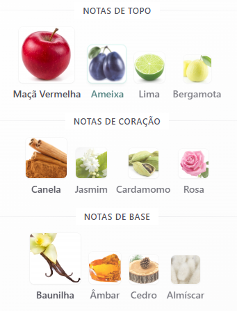 A abertura traz maçã, ameixa e bergamota, oferecendo uma saída vibrante e energizante. No coração, canela, jasmim e rosa acrescentam um toque levemente doce e sensual. No fundo, âmbar, baunilha e cedro garantem profundidade, calor e excelente fixação.