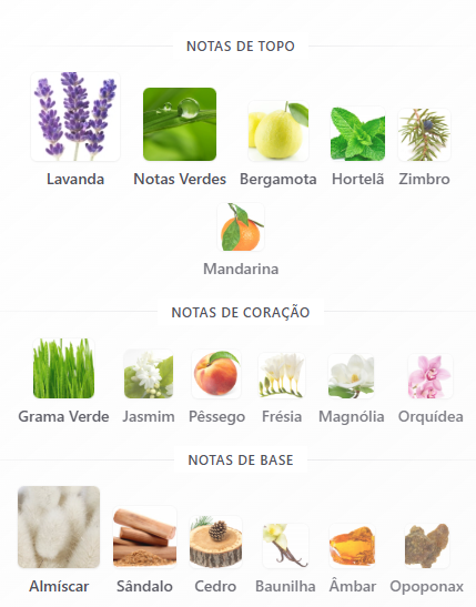 A abertura traz bergamota, lavanda e hortelã, proporcionando frescor e leveza. No coração, jasmim, orquídea e magnólia adicionam um toque floral suave e refinado. No fundo, almíscar, sândalo e âmbar garantem um rastro confortável, elegante e duradouro.