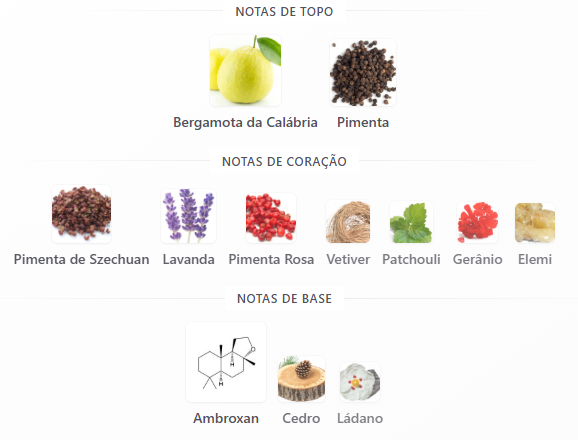 A abertura combina bergamota e pimenta preta, proporcionando um frescor vibrante e energizante.