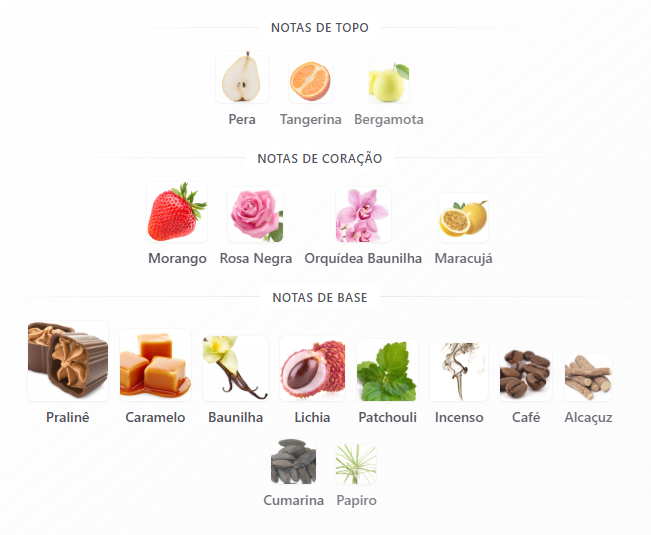 No fundo, pralinê, patchouli, incenso e litchi garantem profundidade, doçura e excelente fixação.