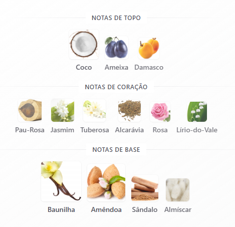 No fundo, baunilha, sândalo e amêndoa garantem cremosidade, profundidade e excelente fixação, deixando um rastro quente e inesquecível.