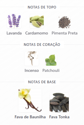 A abertura combina pimenta preta, cardamomo e lavanda, criando um início vibrante, especiado e energizante.